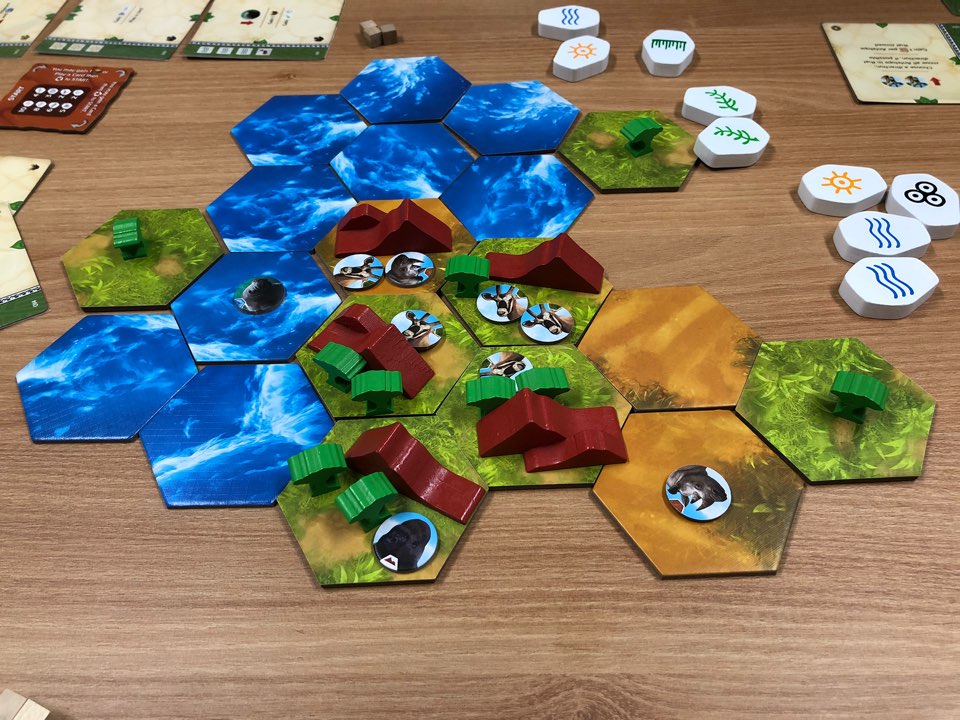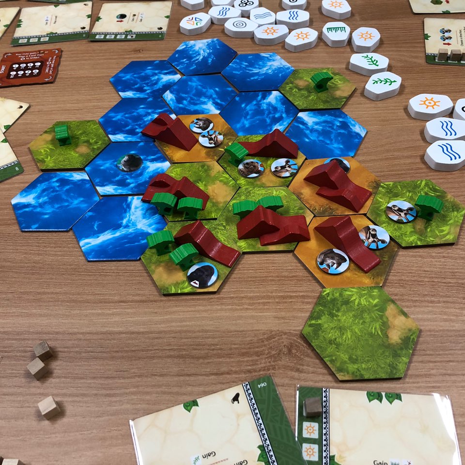 카드 능력을 사용하면 사막/초원/물 타일을 놓으며 대륙을 넓혀나가거나 동물이나 술/산을 배치할 수 있습니다.